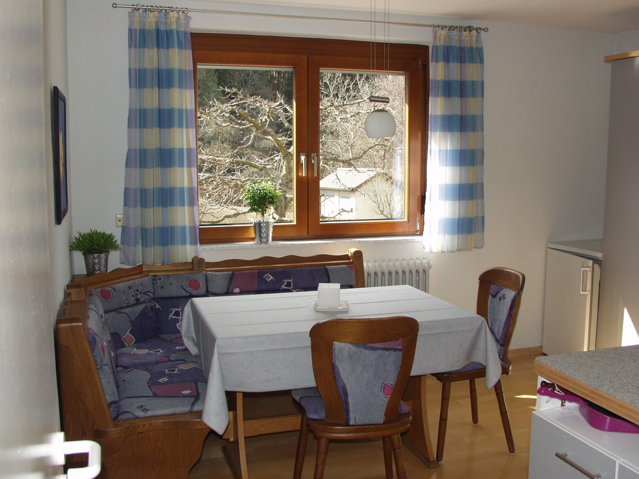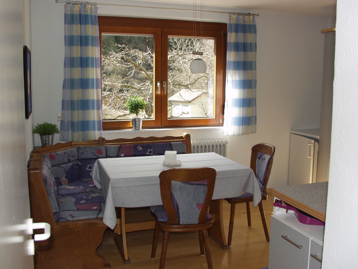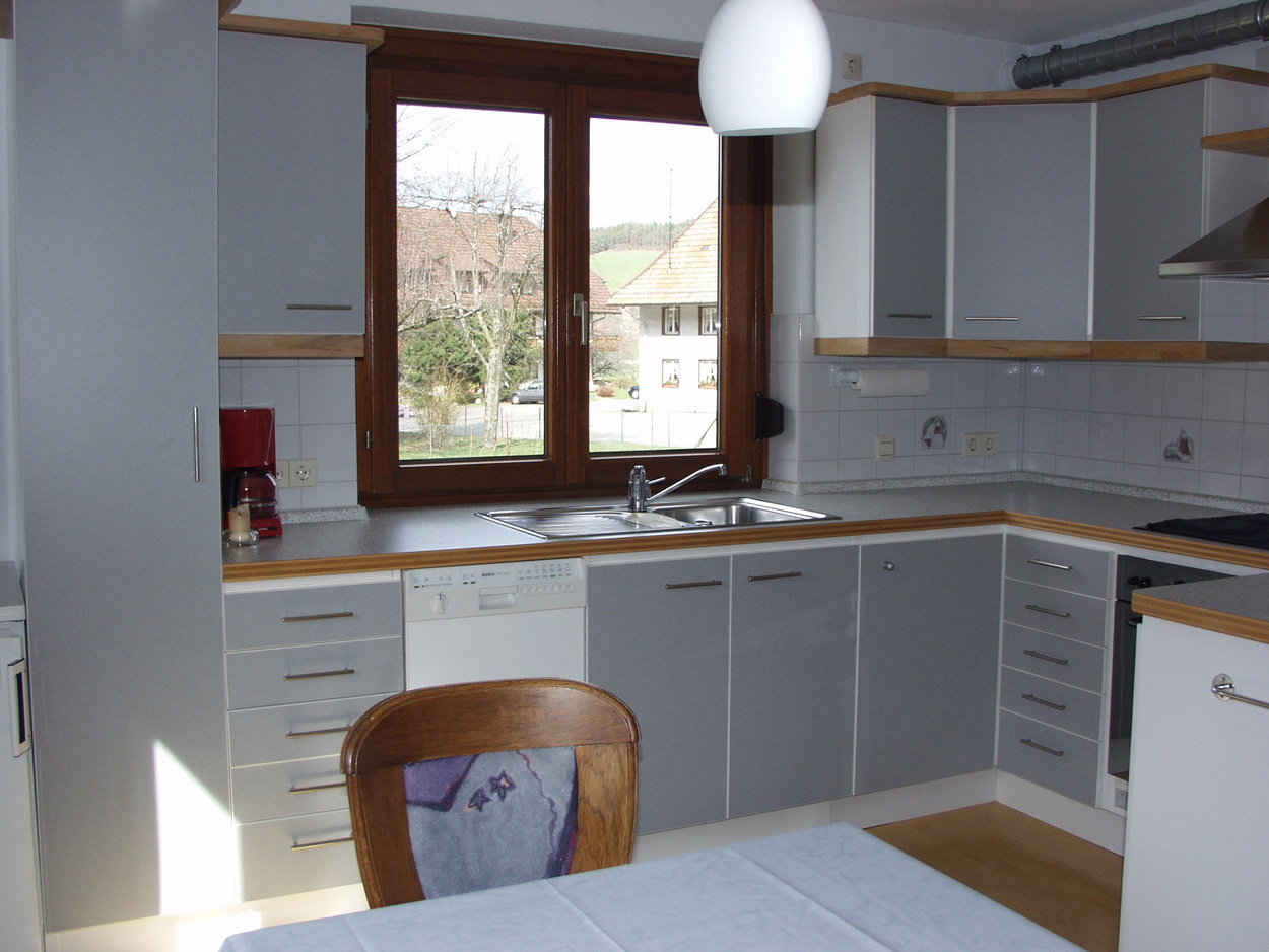 In der modernen Wohnküche finden Sie alles, was zu einer gehobenen Ausstattung gehört: 4-Plattenherd mit Backofen, Dunstabzug, Spülmaschine, Kühlschrank, Wasserkocher und Kaffeemaschine. Vom hellen, geräumigen Schlafzimmer aus haben Sie Blick in den Garten. Das Bad ist mit Dusche, WC und Waschmaschine ausgestattet. Im Wohnzimmer befindet sich eine Sitzgruppe mit Tisch, Sat-TV und Stereoanlage. Die eine Couch ist ausklappbar und ergibt eine zusätzliche Schlafmöglichkeit für 2 Personen (Liegefläche von 1,40 x 2,00 m). Vom Wohnzimmer aus geht es auf die Terrasse, dem "Goldstück" dieser Ferienwohnung. Die gemütlichen Holz-Sitz-Möbel laden zum Entspannen und Essen im Freien ein. Hier können Sie ausruhen und die Aussicht auf die umliegenden Schwarzwaldberge genießen.Bilder: Unsere Ferienwohnung Goldbergblick