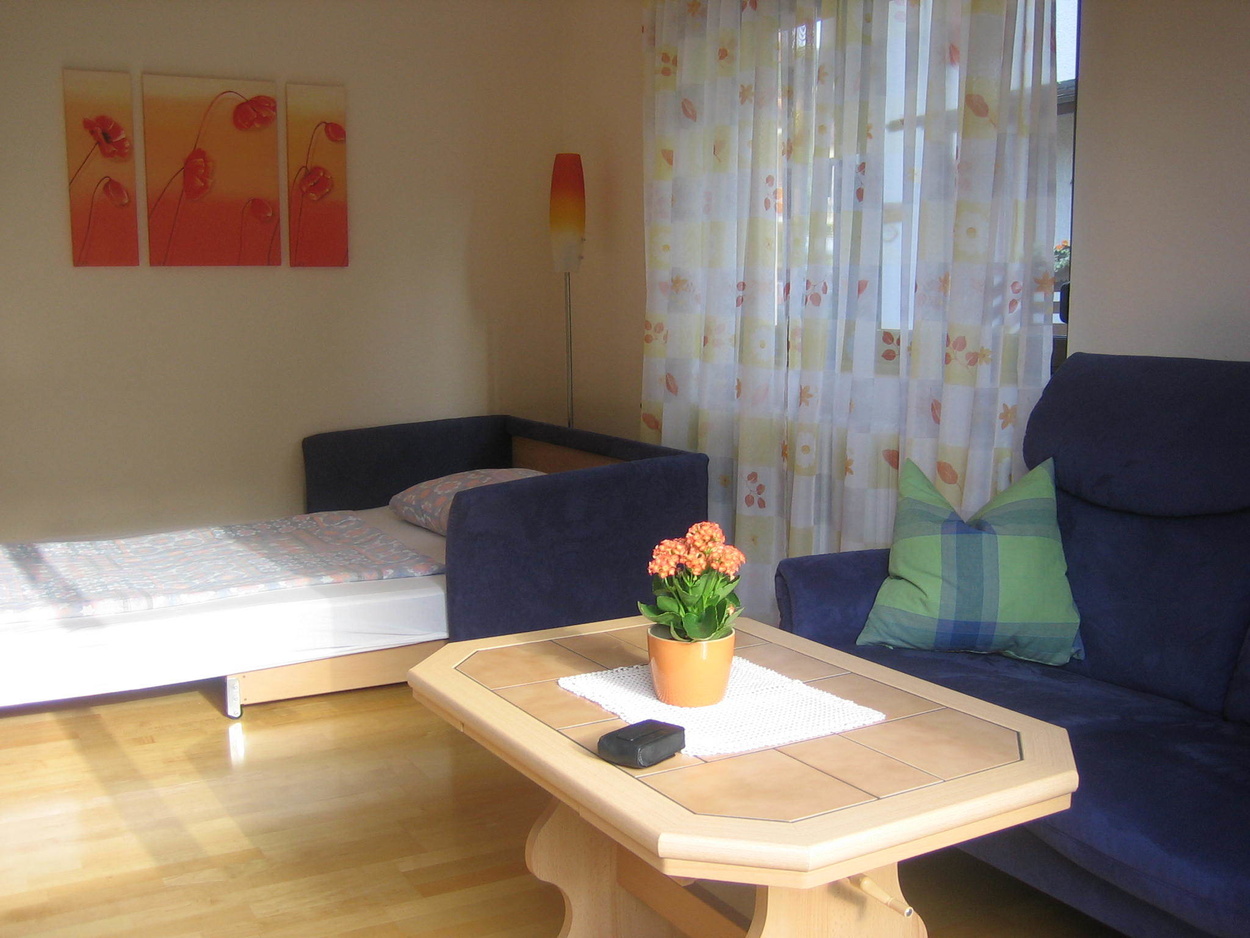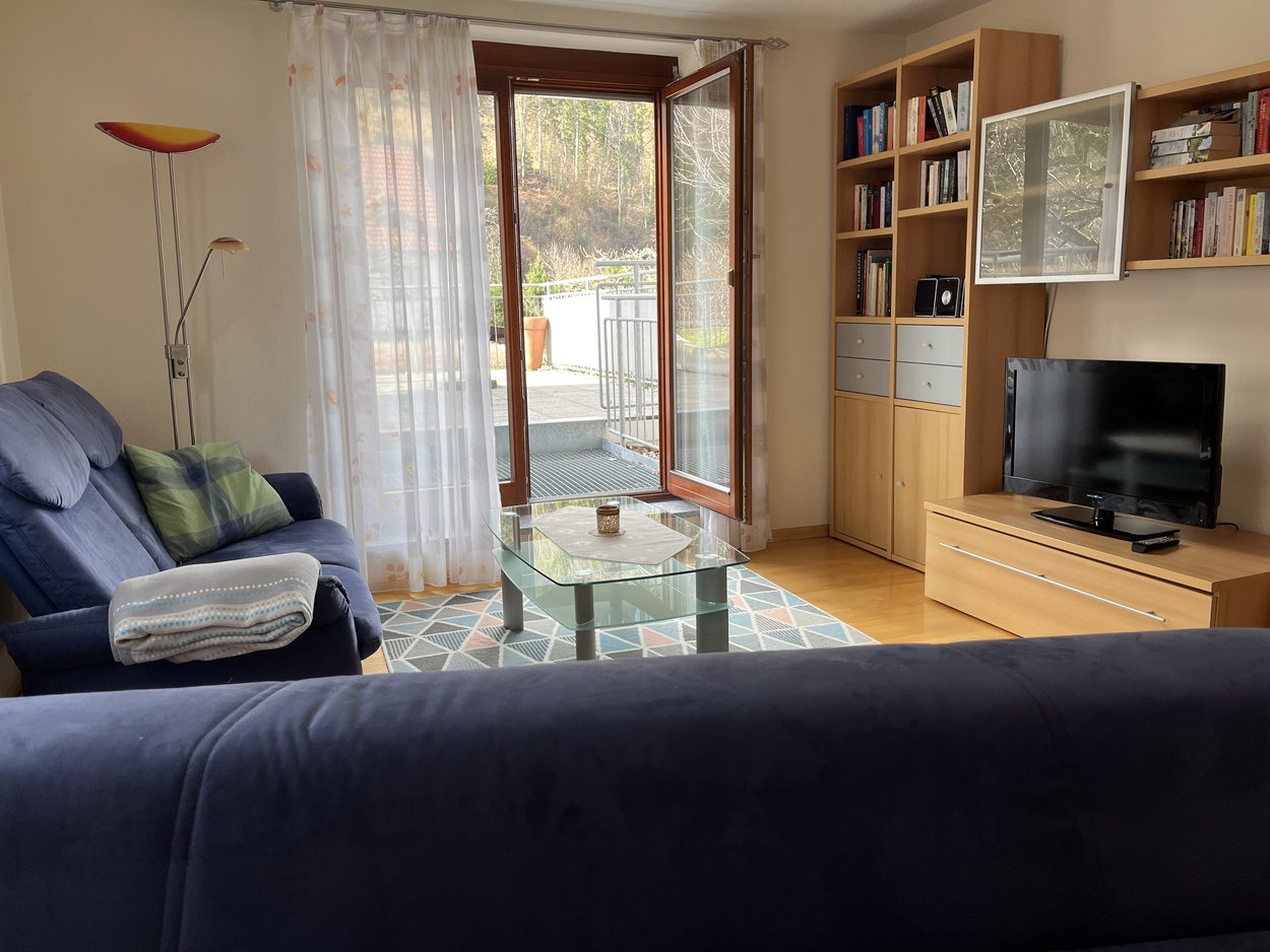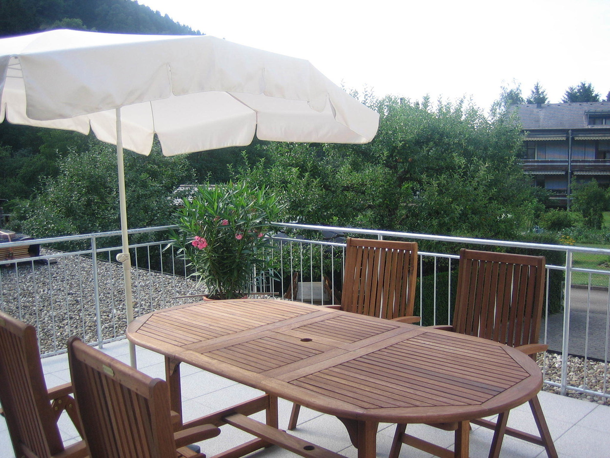 In der modernen Wohnküche finden Sie alles, was zu einer gehobenen Ausstattung gehört: 4-Plattenherd mit Backofen, Dunstabzug, Spülmaschine, Kühlschrank, Wasserkocher und Kaffeemaschine. Vom hellen, geräumigen Schlafzimmer aus haben Sie Blick in den Garten. Das Bad ist mit Dusche, WC und Waschmaschine ausgestattet. Im Wohnzimmer befindet sich eine Sitzgruppe mit Tisch, Sat-TV und Stereoanlage. Die eine Couch ist ausklappbar und ergibt eine zusätzliche Schlafmöglichkeit für 2 Personen (Liegefläche von 1,40 x 2,00 m). Vom Wohnzimmer aus geht es auf die Terrasse, dem "Goldstück" dieser Ferienwohnung. Die gemütlichen Holz-Sitz-Möbel laden zum Entspannen und Essen im Freien ein. Hier können Sie ausruhen und die Aussicht auf die umliegenden Schwarzwaldberge genießen.Bilder: Unsere Ferienwohnung Goldbergblick