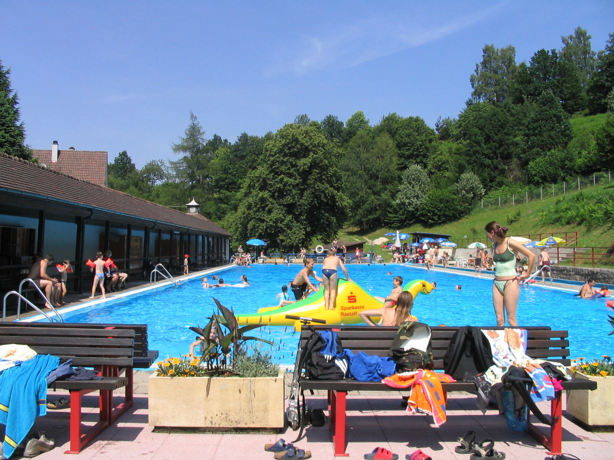 In 500 Metern Höhe gelegenes Freibad mit Bach, Tischtennis, Terrasse, separatem Kleinkindbecken und Kinderhort.
